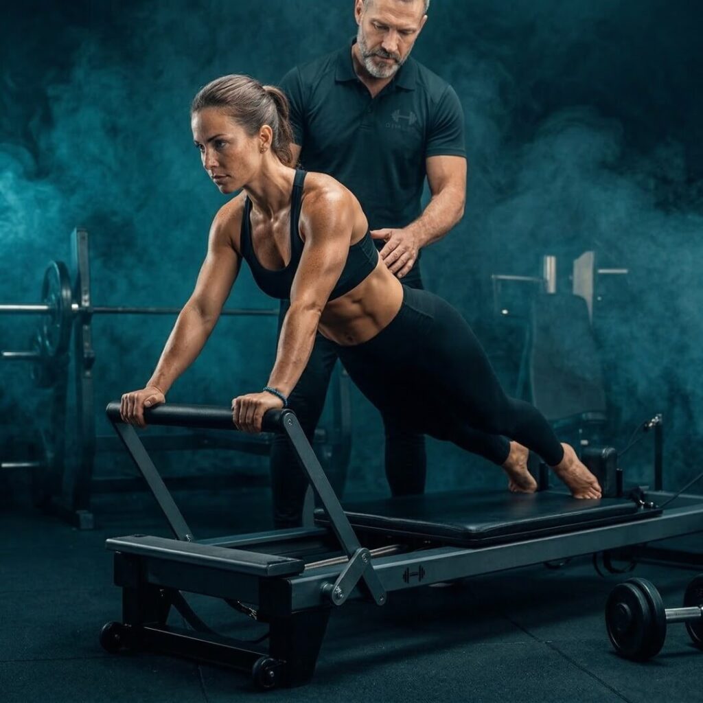 Pilates dentro da sua mensalidade, planejado junto com a musculação para melhorar postura, mobilidade e equilíbrio muscular.